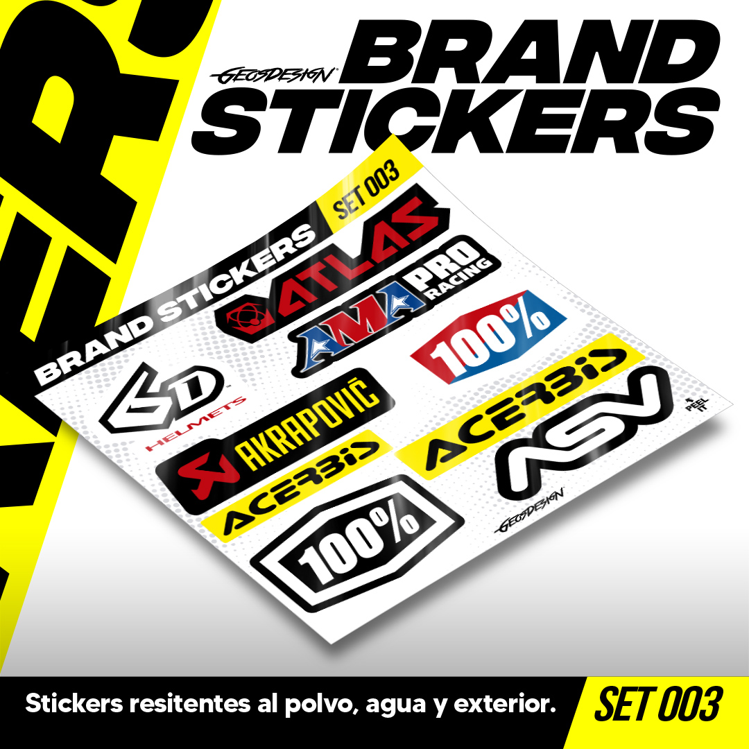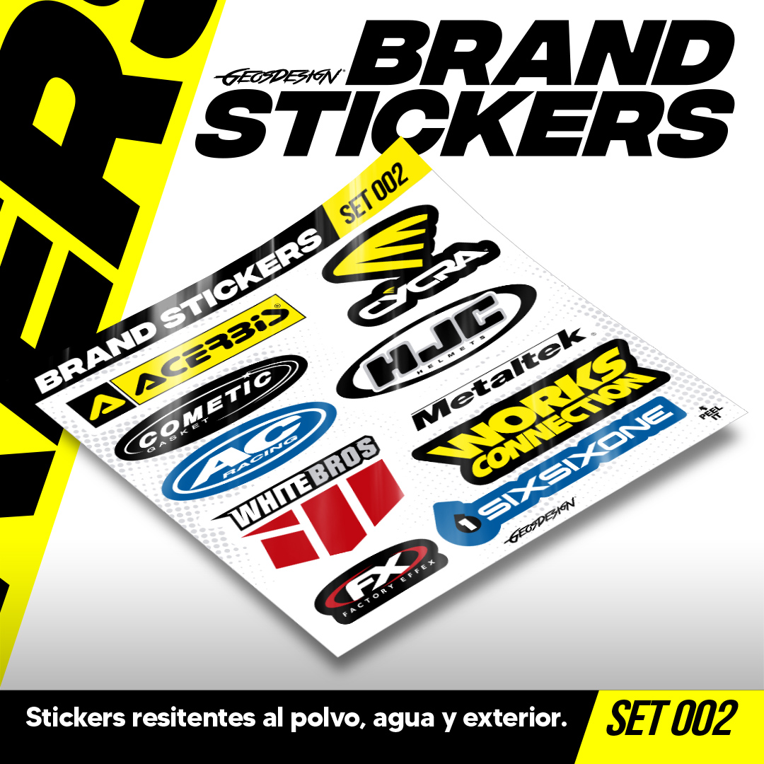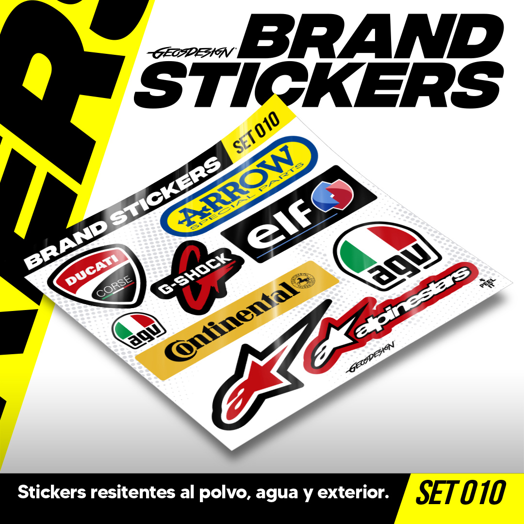 • Son colecciones de stickers de logos de marcas motorsports o lifestyle, se venden en micro sets, son impresos en alta resolución cortados a la forma del logo, cada micro planilla mide 20x20 cm (El tamaño de los stickers puede variar según el diseño). son tanto para interior y exterior, ¡Pegalos donde quieras!